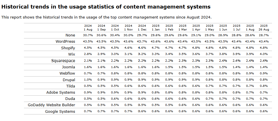 According to W3techs.com, the share trends for CMS solutions is as follows: